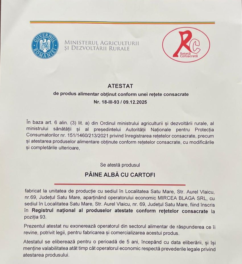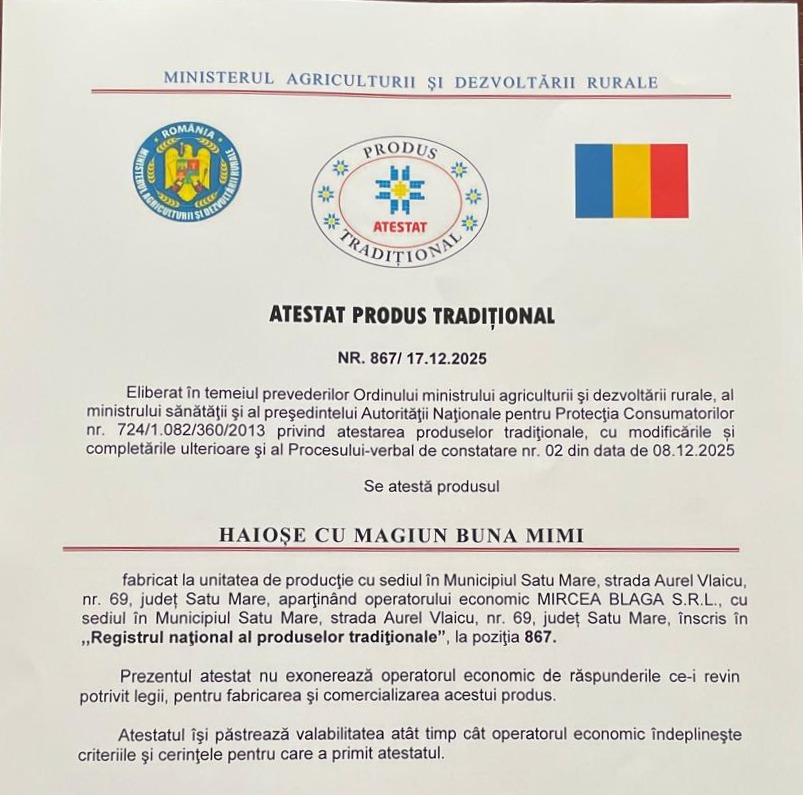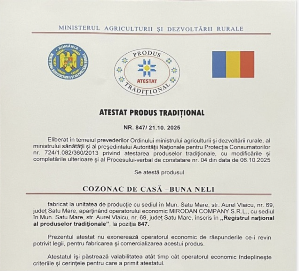 La noi, tradiția nu este doar un cuvânt, ci un angajament certificat. Suntem mândri să vă anunțăm că produsul nostru de suflet, Cozonacul de Casă “Buna Neli”, a primit oficial titlul de Produs Tradițional (Atestat Nr. 847/2025).